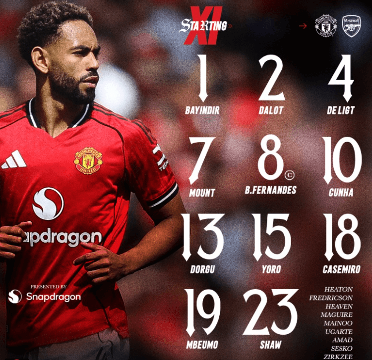 Manchester United are ready to start their new Premier League season, hoping to do much better than in the last one. Altay Bayindir is surprisingly in goal for the clash against Arsenal, while Ruben Amorim has decided to continue with his favourite 3-4-2-1 system. Leny Yoro and Luke Shaw will be either side of Matthijs de Ligt in the back three, Casemiro and Bruno Fernandes will be in central midfield, while it is Diogo Dalot and Patrick Dorgu who take up the wing-back positions. Mason Mount gets the chance alongside Bryan Mbeumo, while Matheus Cunha is the sole striker for this match.