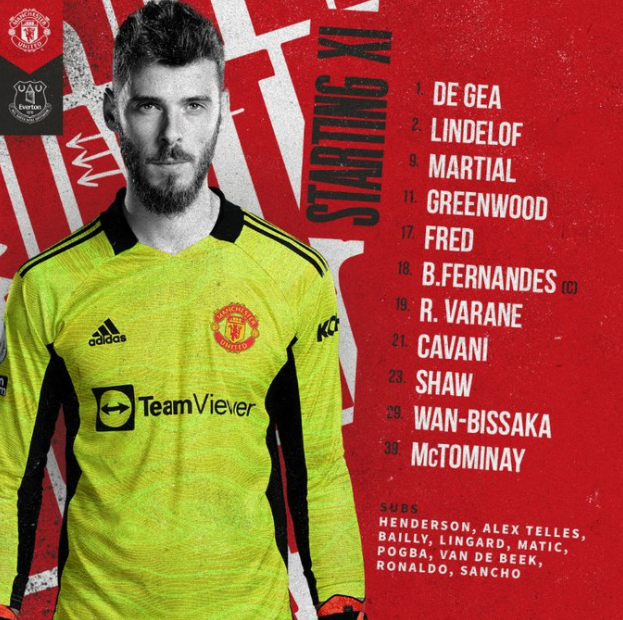 Manchester United are ready for Everton, but with a few surprises in the starting lineup! Ole Gunnar Solskjaer has decided to keep Cristiano Ronaldo, Paul Pogba and Jadon Sancho on the bench, as Edinson Cavani will start up front, Anthony Martial will take the spot on the left wing and Mason Greenwood is our right winger against the Toffees. Everything else is as usual. Victor Lindelof is replacing the injured Hrary Maguire, Fred and Scott McTominay are the double pivot in a 4-2-3-1, while Bruno Fernandes captains the team from his favourite role behind the striker. Let’s see what this team can do today.