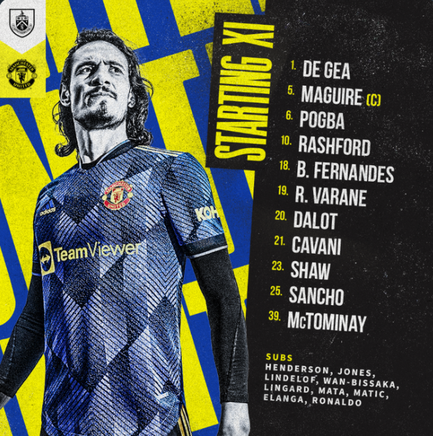 Manchester United are back in Premier League action. Here is the team Ralf Rangnick has decided to pick for the visit to Turf Moor – David de Gea is once again in goal, with Luke Shaw and Diogo Dalot as the full-backs. Harry Maguire captains the team alongside Raphael Varane, while Scott McTominay and Paul Pogba will make the double pivot in the 4-2-3-1 system. Marcus Rashford moves to right wing, while Jadon Sancho is on the left. Edinson Cavani starts up front ahead of Cristiano Ronaldo, while Bruno Fernandes will be in the number 10 role.