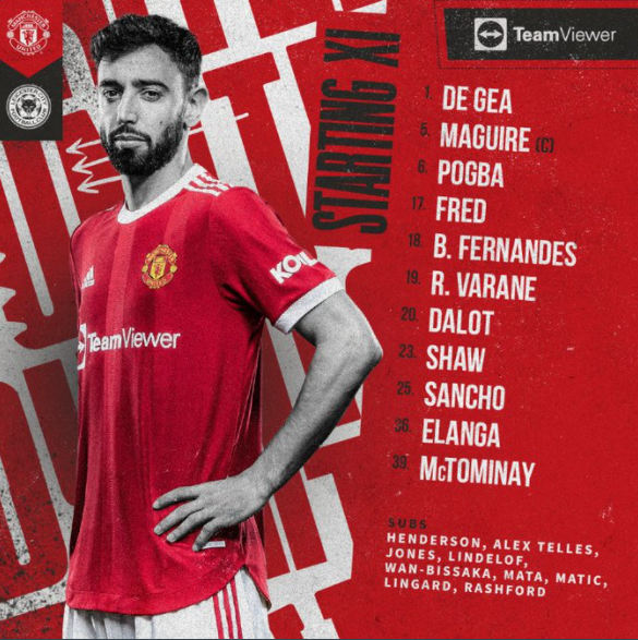 Manchester United are back in Premier League action after two weeks’ break following the international football and World Cup qualifiers. It is once again we play this season without the proper striker, as neither Cristiano Ronaldo nor Edinson Cavani are ready for the task. Bruno Fernandes will be the false nine, with Paul Pogba right behind him. Jadon Sancho and Anthony Elanga are the two wingers, while Fred and Scott McTominay will be patroling in front of the back four. That back four consists of captain Harry Maguire and Rapahel Varane in the middle, and with Diogo Dalot and Luke Shaw on the flanks. Obviously, David de Gea starts in goal as usual.