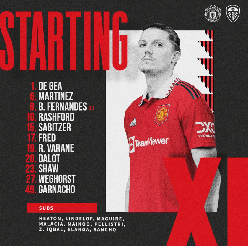 Manchester United are about to play their first match against Leeds this week and there are some expected changes in Erik Ten Hag’s side. Casemiro is out due to suspension, forcing Marcel Sabitzer in the starting lineup, for his full debut. He will play alongside Fred, in front of Lisandro Martinez and Raphael Varane in central defence. Luke Shaw and Diogo Dalot are the full-backs, as the Portuguese returns to full fitness. David De Gea is as usually in goal, while Bruno Fernandes is the captain behind the striker Wout Weghorst. Marcus Rashford starts on one of the wings, while Alejandro Garnacho replaces Antony on the other.