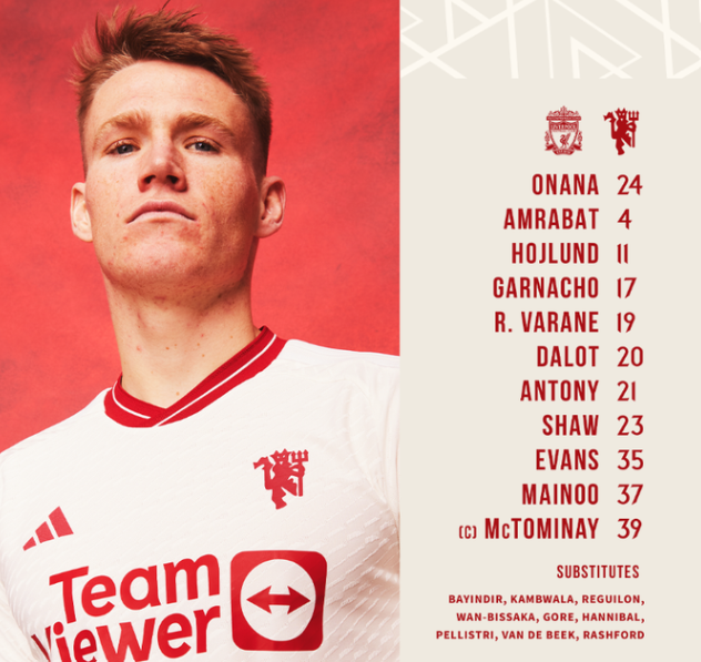 Manchester United are ready for the big clash at the Anfield and Erik Ten Hag has decided on a different kind of team. Andre Onana is in goal and in front of him are the two centre-backs in Jonny Evans and Raphael Varane. Luke Shaw is at left-back, while Diogo Dalot is on the opposite flank. What is interesting here is that all of Kobbie Mainoo, Sofyan Amrabat and Scott McTominay are starting in central midfield. We will see whether McTominay will get further forward to make this system a 4-2-3-1, since Antony and Alejandro Garnacho are the two wingers and Rasmus Hojlund is the sole striker.