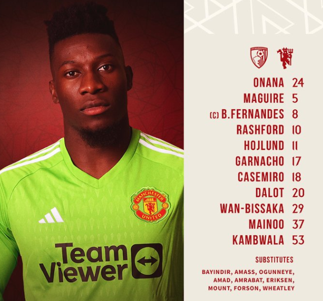 Manchester United are ready for the trip to the south coast and there are some interesting names in the starting lineup. Most notably, Willy Kambwala gets the nod in central defence alongside Harry Maguire and it will be interesting to see the young Frenchman in action from the off. Diogo Dalot and Aaron Wan-Bissaka will be the two full-backs, in a back four in front of Andre Onana. Kobbie Mainoo gets another start this season and alongside Casemiro in central midfield, while Bruno Fernandes is as usual in his favourite number 10 role. Either side of him are Marcus Rashford on the left and Alejandro Garnacho on the right. In the front is Rasmus Hojlund.