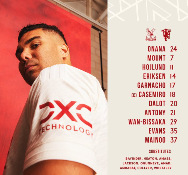The team is ready for Crystal Palace and once again, Erik Ten Hag has had to made several changes. Andre Onana is in goal as usual, while two right-backs are once again occupying both full-back positions – Diogo Dalot and Aaron Wan-Bissaka. Jonny Evans has to start in central defence and alongside makeshift defender Casemiro, who will wear the armband tonight. This is because Bruno Fernandes is not fit for this match and Mason Mount will get in his place. Behind him will be the two central midfielders in Kobbie Mainoo and Christian Eriksen, while the wingers will remain the same – Antony and Alejandro Garnacho. As usual Rasmus Hojlund is the striker leading the line.