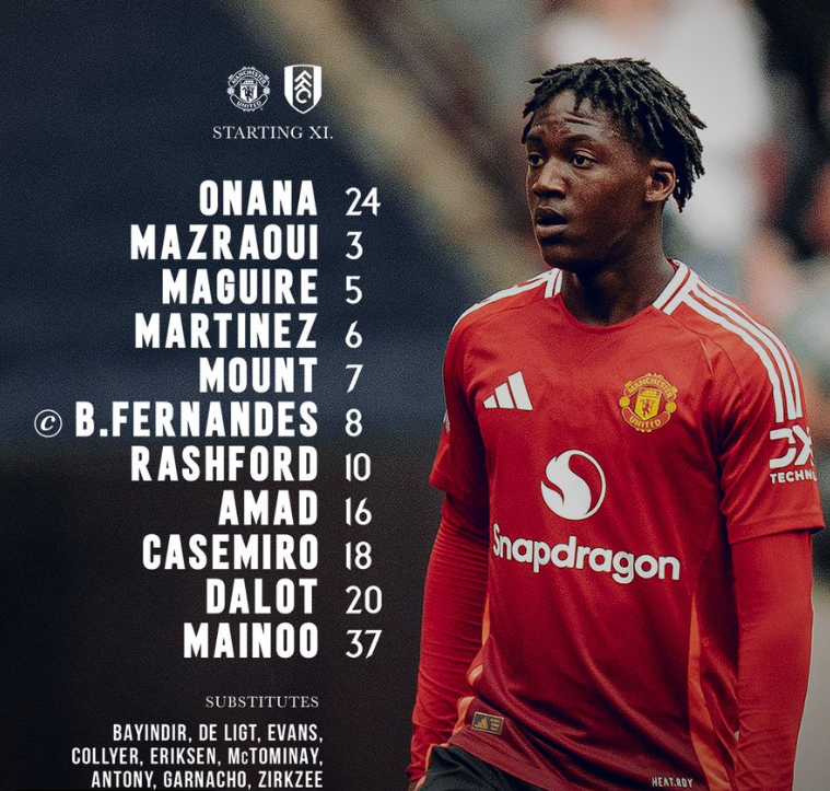 Here is the first starting 11 for Manchester United in the Premier League this season, as Erik Ten Hag once more opts for a team with a ‘false nine’. Bruno Fernandes will captain the team in that role, as Mason Mount starts behind him. Marcus Rashford and Amad Diallo complete the front four as the two wingers. Going from the back of the team, Andre Onana is in goal, while Lisandro Martinez and Harry Maguire are the two centre-backs. Noussair Mazraoui gets his debut start days after joining the club, which means Diogo Dalot moves from right back to left back. Kobbie Mainoo and Casemiro complete the starting lineup as the two central midfielders.
