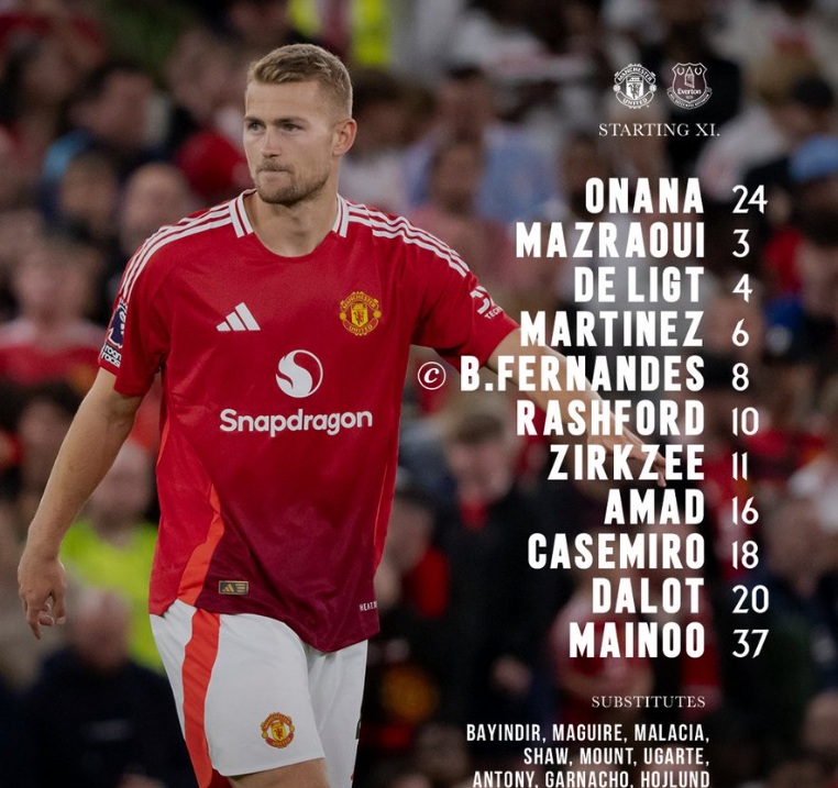 Manchester United are back in Premier League action and once again we get to see an interesting starting lineup from head coach Ruben Amorim. Andre Onana is in goal, with Noussair Mazraoui complementing Matthijs de Ligt and Lisandro Martinez in the back three. Central midfield partnership is made up of Casemiro and Kobbie Mainoo, while Amad Diallo and Diogo Dalot are the two wing-backs this afternoon. Marcus Rashford is moved to attacking midfield alongside Bruno Fernandes, but up front is a change, as Joshua Zirkzee gets the starting spot.