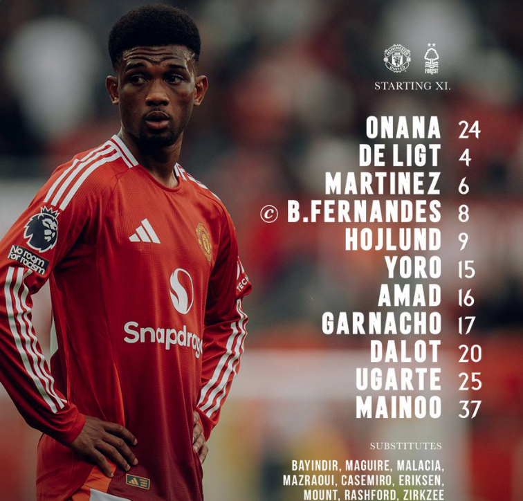 Manchester United are ready for their second Premier League match this week and here is the team set to face Nottingham Forest. Andre Onana is in goal as usual, but it is Leny Yoro who gets his full debut for the Red Devils in the back three. He will be on the right, with Matthijs de Ligt in the middle and Lisandro Martinez on the left. Diogo Dalot and Amad Diallo will once more be the two wing-backs, and in between them will be the central midfield partnership of Kobbie Mainoo and Manuel Ugarte. Bruno Fernandes captains the team from the attacking midfield position, where this time he is joined by Alejandro Garnacho. This leaves place for Rasmus Hojlund up front, with Marcus Rashford starting on the bench.
