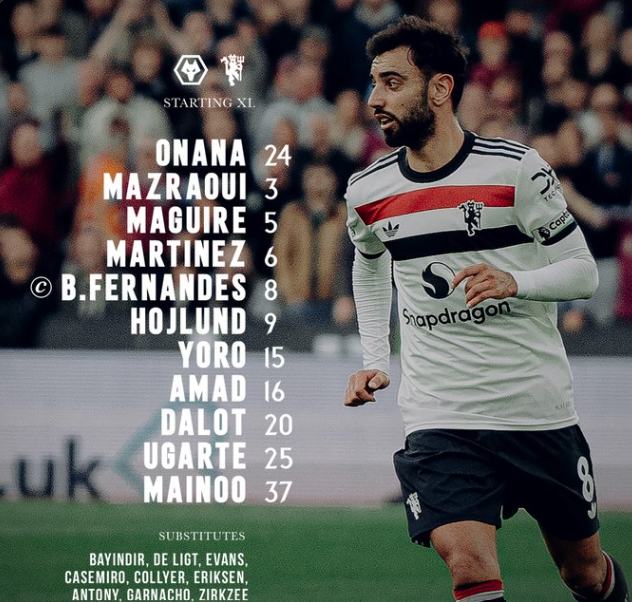 Manchester United are on a poor run of results in the past week and they get a new chance to get back to their winning ways. Andre Onana is in goal for the trip to the Molineaux, with Harry Maguire marshalling the back three. Either side of him will be Leny Yoro and Lisandro Martinez, while the combo of Noussair Mazraoui and Diogo Dalot once more take up the wing-back positions. Manuel Ugarte are also the central midfield partnership once more, while there are no changes behind the main striker either. This means Amad Diallo and Bruno Fernandes start behind Rasmus Hojlund, while Marcus Rashford remains out of contention.