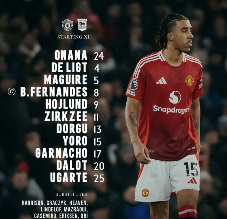 Manchester United are back in Premier League action and in search for important three points against Ipswich Town. Ruben Amorim chose his favourite 3-4-2-1 formation once again, with Andre Onana in goal and Harry Maguire the main main in the back three. Alongside him will be Leny Yoro and Matthijs de Ligt, while Bruno Fernandes once more gets moved back to central midfield. There, he will partner up with Manuel Ugarte, while Patrick Dorgu is at left wingback once again. Diogo Dalot is on the opposite flank to the new Danish signing, while Joshua Zirkzee will once more try to leave a better impression playing behind the striker. In that role will also be Alejandro Garnacho, as the Dutchman and the Argentine will be playing off the lone striker Rasmus Hojlund.