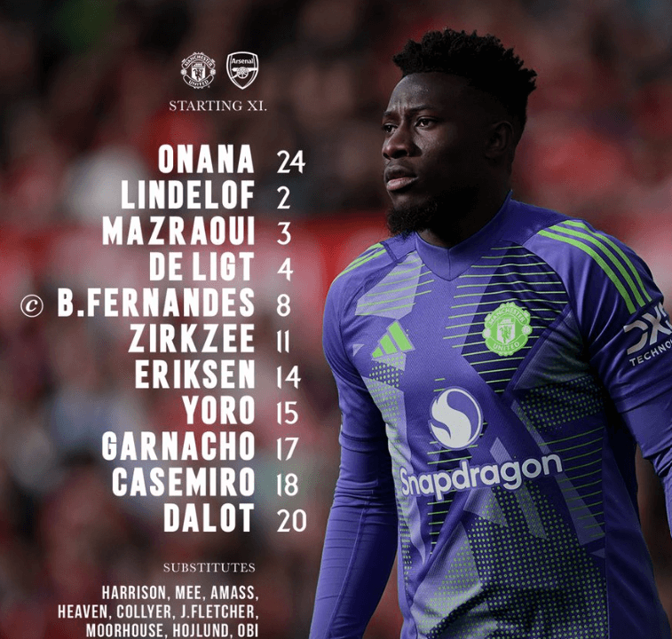 Manchester United are ready to face Arsenal at Old Trafford, as Ruben Amorim chose his 11. Andre Onana is in goal and a back three is somewhat changed, with Victor Lindelöf in the central position. Matthijs de Ligt and Leny Yoro are either side of him, while Casemiro will marshal the central midfield alongside Bruno Fernandes. Diogo Dalot and Noussair Mazraoui are once more the two wingbacks due to Patrick Dorgu’s suspension. Alejandro Garnacho and Christian Eriksen get the task of playing just behind the striker Joshua Zirkzee.