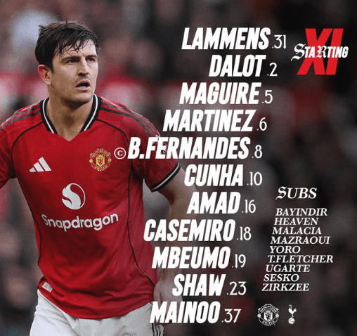 Manchester United have won three Premier League matches on the bounce and today they are going for fourth, against Tottenham. Michael Carrick did not change much his lineup. Senne Lammens is in goal, Harry Maguire and Lisandro Martinez are the two centre-backs, while Diogo Dalot and Luke Shaw take up the full-back positions. Casemiro and Kobbie Mainoo once again play together in central midfield. Bruno Fernandes is the attacking midfielder, while Amad Diallo will be on the right wing, Bryan Mbeumo will be on the left, while Matheus Cunha is the lone striker.